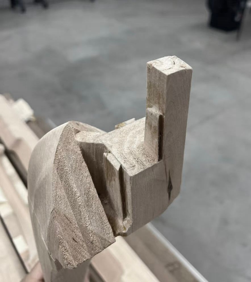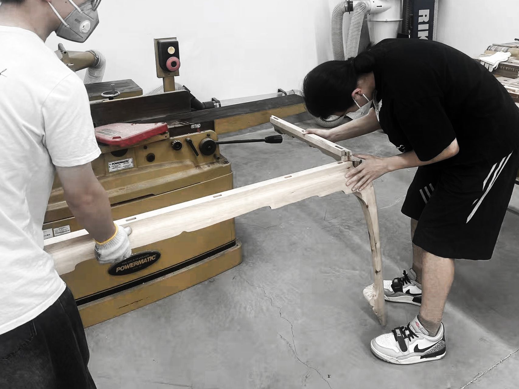 掌握智能技术,成为身体技术的延伸,扩展“手”的能力边界,尝试为非遗活化加入新的内容。这次创作在设计阶段结合手作与虚拟仿真、3D打印技术结合,增进打样效率,减少消耗;定形后运用5轴智能加工中心进行榫卯部件的制作,再进行手作深入与精修,这样提高出品精度与效能,从而扩展学生技艺,探索木艺技能的当代表现。