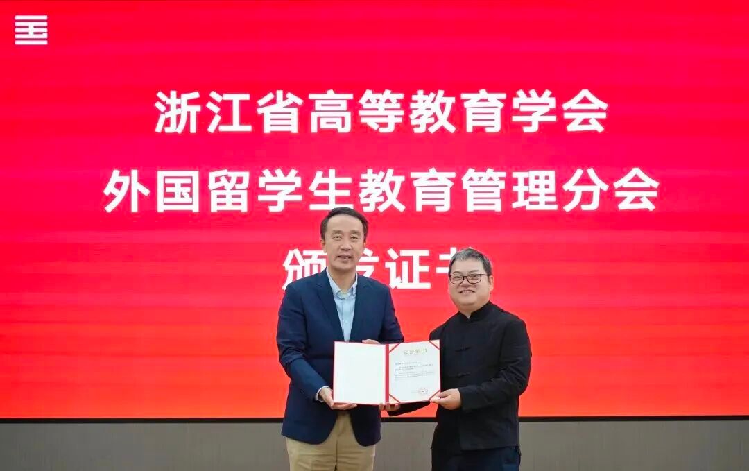次日,浙江省高等教育学会外国留学生教育管理分会会长姚楠一行来访,并为其颁发“浙江省来华留学生优秀毕业生称号”证书。姚楠表示,胡建成的捐赠凝聚着对母校与祖国的深厚情感,这份国美人的反哺情怀令人动容。他呼吁更多留学生毕业后持续与母校保持联系,积极参与母校建设,共同助力来华留学教育事业的高质量发展。