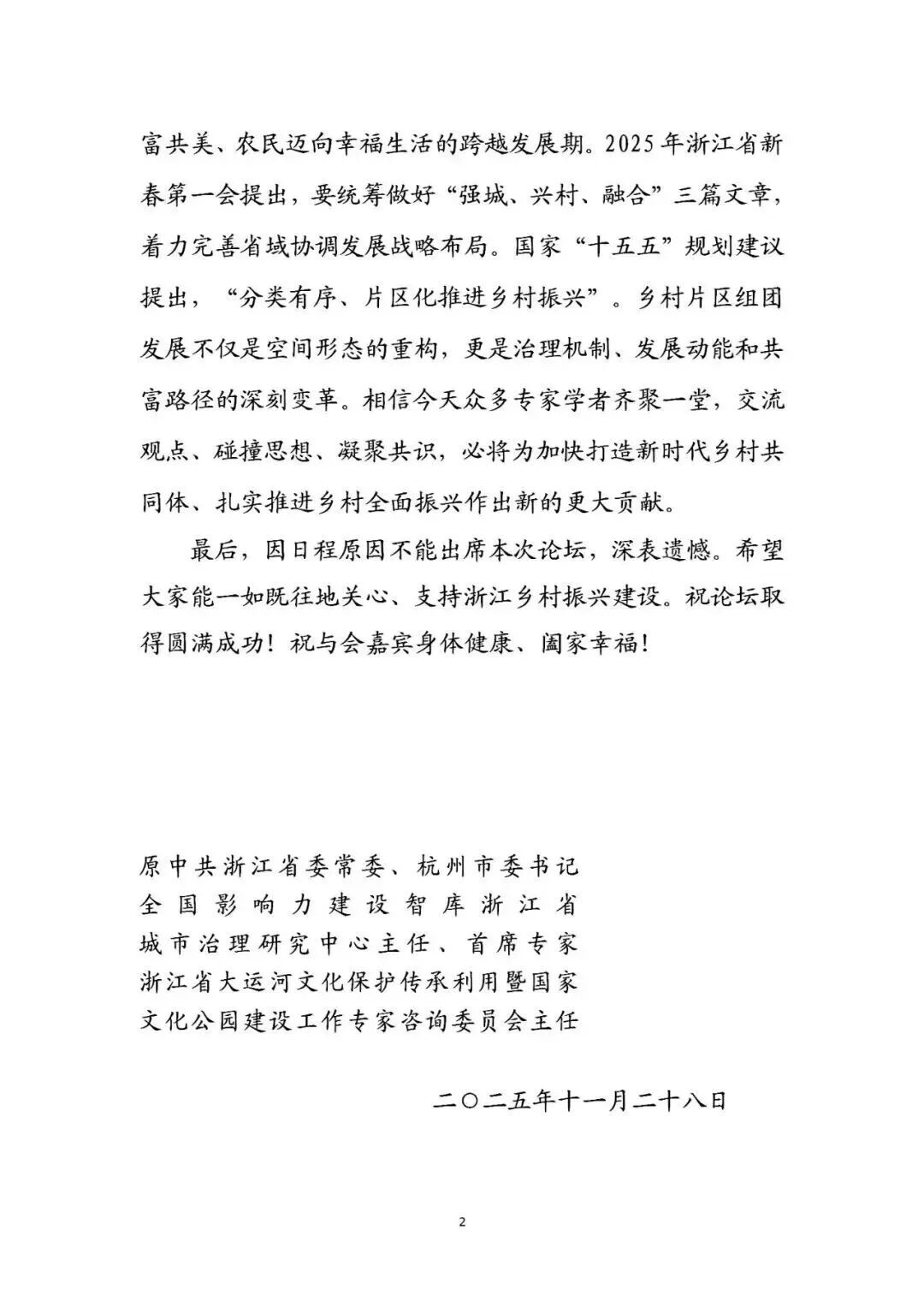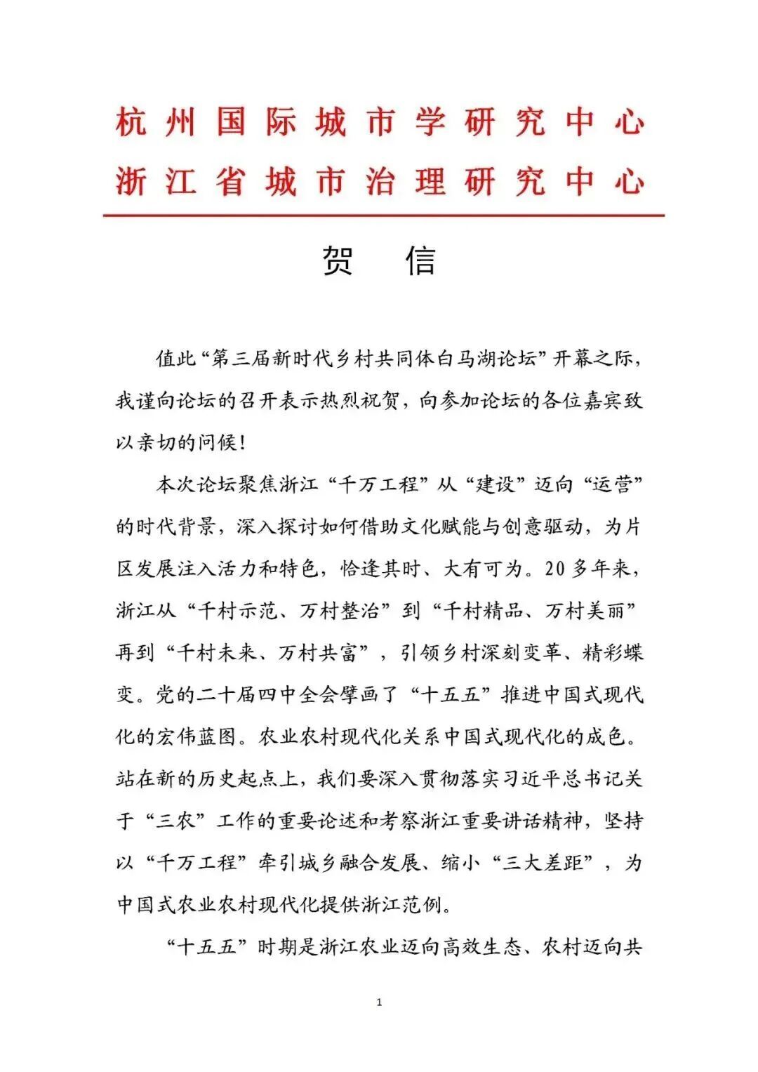 中国(杭州)智慧城市研究院院长邵莹代表王国平同志宣读贺信。贺信向论坛的召开表示热烈祝贺,贺信中指出,本次论坛聚焦浙江“千万工程”从“建设”迈向“经营”的关键阶段,探讨文化赋能与创意驱动片区发展,恰逢其时、大有可为。贺信回顾了“千万工程”引领浙江乡村深刻蝶变的历程,强调需深入贯彻落实中央精神,以“千万工程”牵引城乡融合发展,为中国式农业农村现代化提供浙江范例。本届论坛的智慧碰撞必将为加快打造新时代乡村共同体、推进乡村全面振兴贡献。