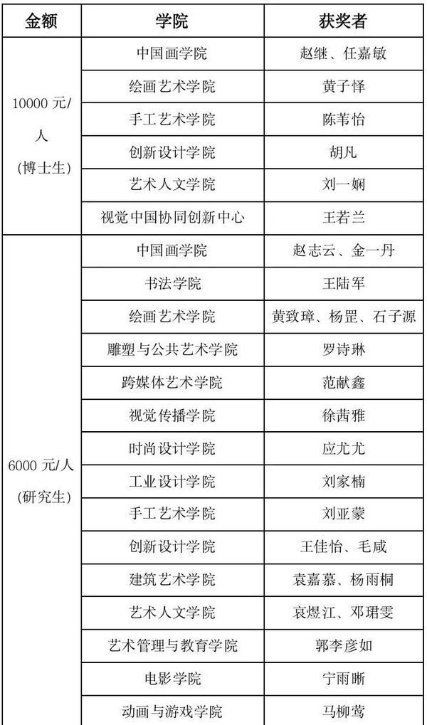 浙江中国美术教育基金会每年在学校设立多项奖学金、助学金及奖教金支持学校发展。2023年,实际发放62.4万元,受益人数达81人。其中,共12人获得崇丽艺术优秀作品奖(10人10000元/人,2人5000元/人);共8人获得NORHOR奖助学金(奖学金10000元/人,助学金5000元/人);共8人获得万泰铝业助学金(5000元/人);共31人获得2023研究生林风眠奖学金(博士生:10000元/人、研究生6000元/人);共4人获得诸乐三奖学金(5000元/人);共2人获得嘉德徐邦达艺术教育奖学金(10000元/人);共16人获2023教师辅导奖奖金(10000元/人)。获奖名单如下: